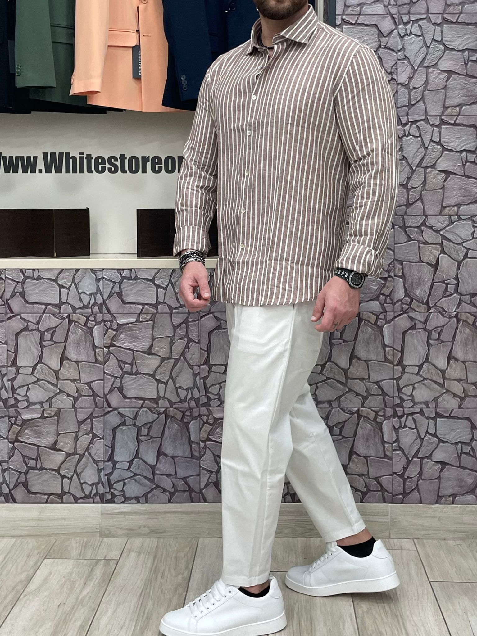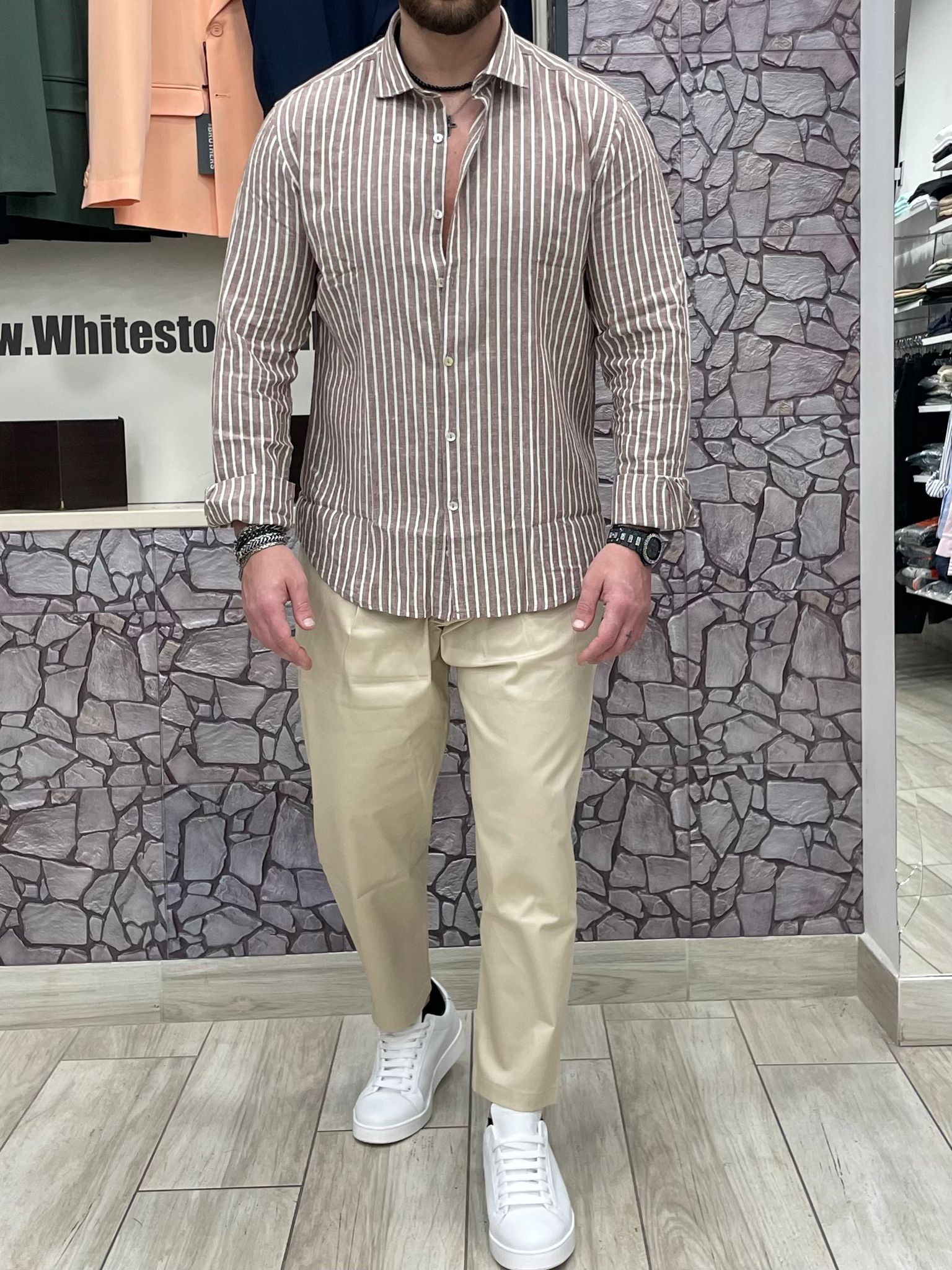 Camicia akirΓ² 100% Lino fantasia righe colore Tabacco/bianco
