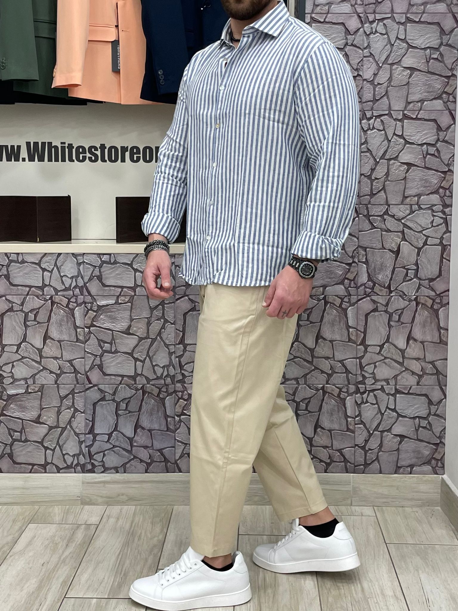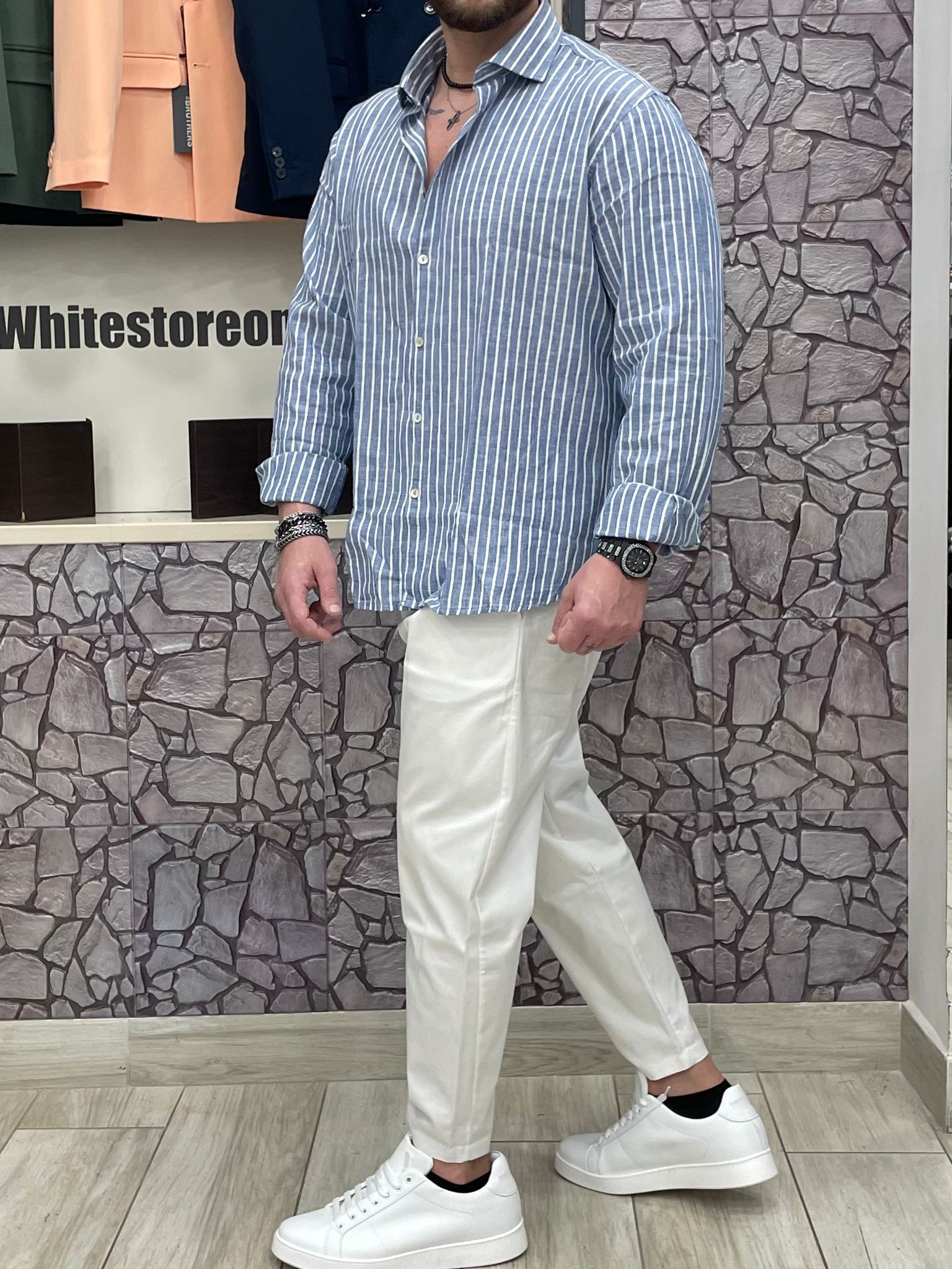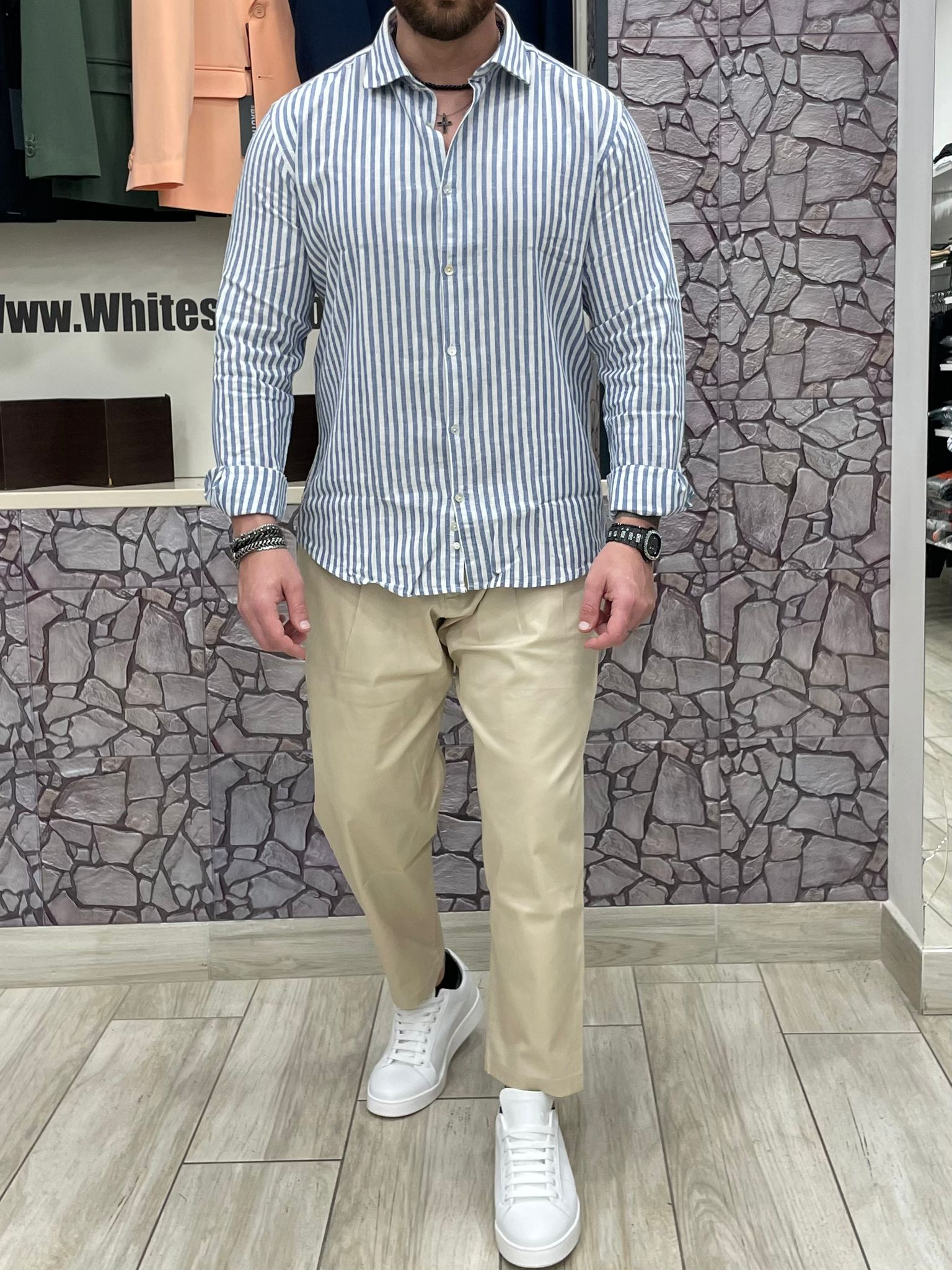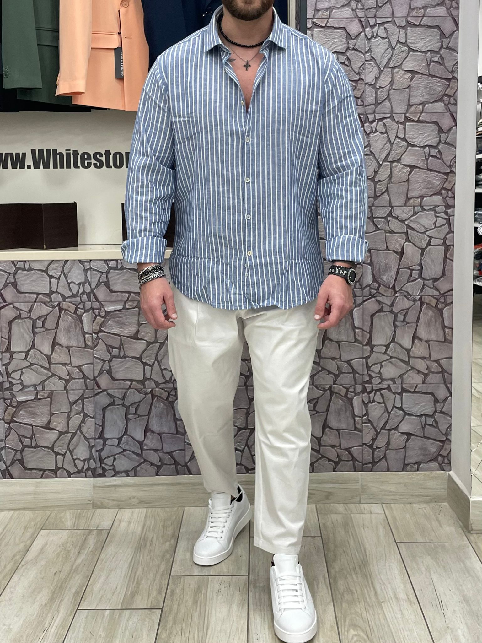 Camicia akirΓ² 100% Lino fantasia righe colore bianco/azzurro